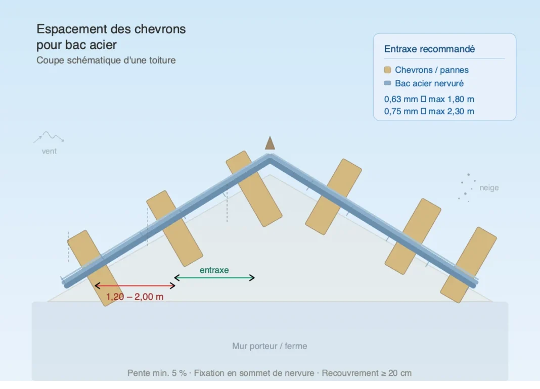 Un espacement mal calculé entre les chevrons d’une toiture en bac acier, c’est le genre d’erreur invisible le jour de la pose. Les conséquences, elles, se manifestent au premier hiver : tôles qui fléchissent sous la neige, infiltrations aux recouvrements, fixations qui lâchent sous les rafales. Environ 35 % des sinistres sur toitures métalliques sont liés à un entraxe trop large. La bonne nouvelle : quelques règles claires suffisent à dimensionner correctement sa structure, que ce soit pour un garage, un hangar agricole ou une extension d’habitation.