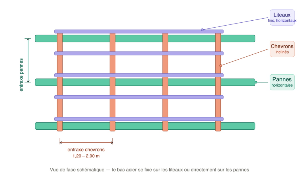 La confusion entre ces trois éléments revient systématiquement. Sur une charpente bois , les chevrons sont les pièces inclinées qui suivent la pente. Les pannes, horizontales, relient les fermes entre elles. Les liteaux, fixés sur les chevrons, accueillent la couverture. Sur une charpente métallique , les chevrons n’existent pas au sens strict. Ce sont des pannes en acier (profilés en C, Z ou Sigma) qui supportent directement le bac acier. Le terme « chevron » est donc souvent employé par abus de langage.